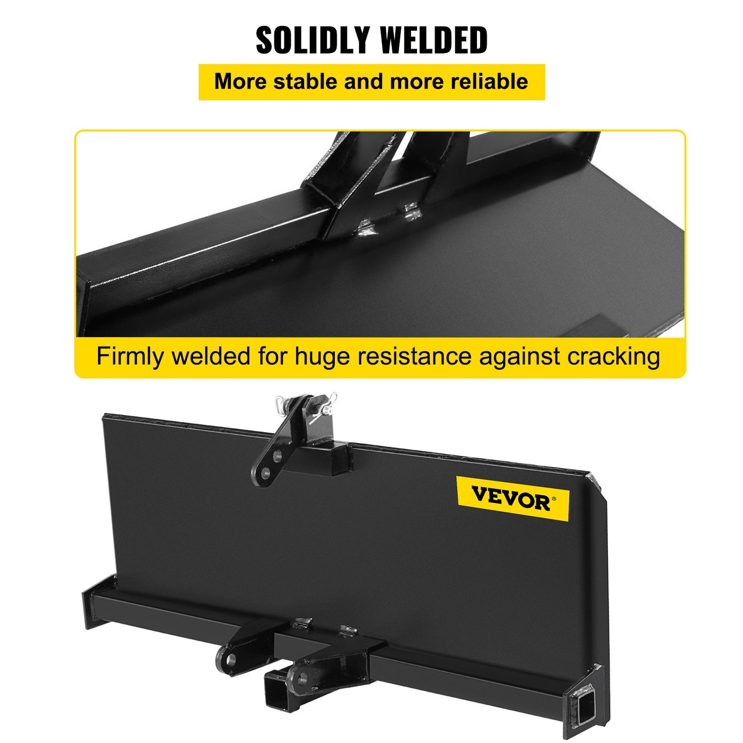 This 3-point skid steer mount plate is universally compatible with loaders, tractors and other vehicles with an internal width up to 43 3/4". It is equipped with a 2" trailer receiver and two lifting arms which can be adjusted from 8" to 43 3/4".