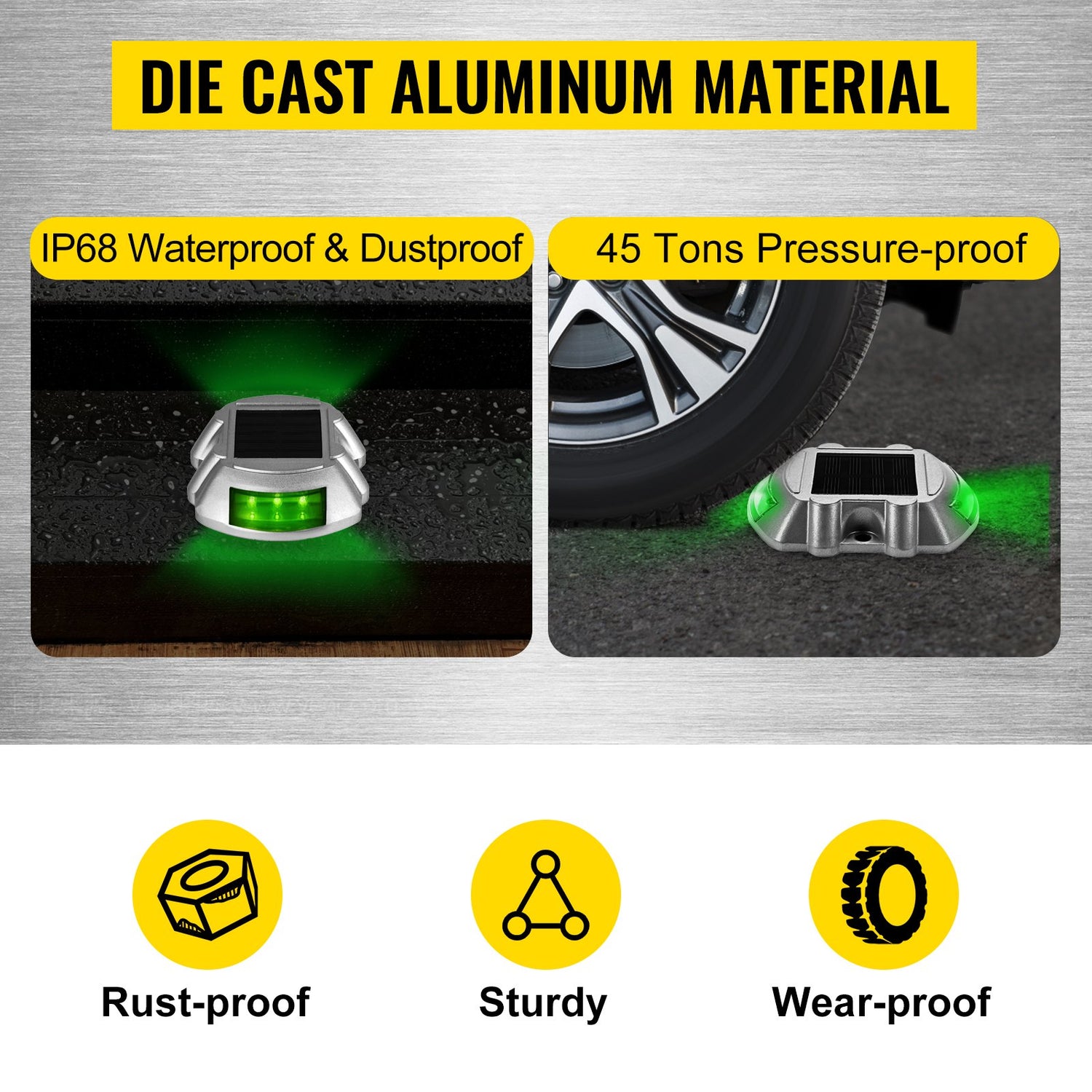 Light intensity: 400-500Lux. Each solar driveway light is equipped with 6 PCs 0.2" high-brightness green LED lights, illuminating the space within a radius of 875 yards. Built-in 600mAH large storage battery ensures enough working time.