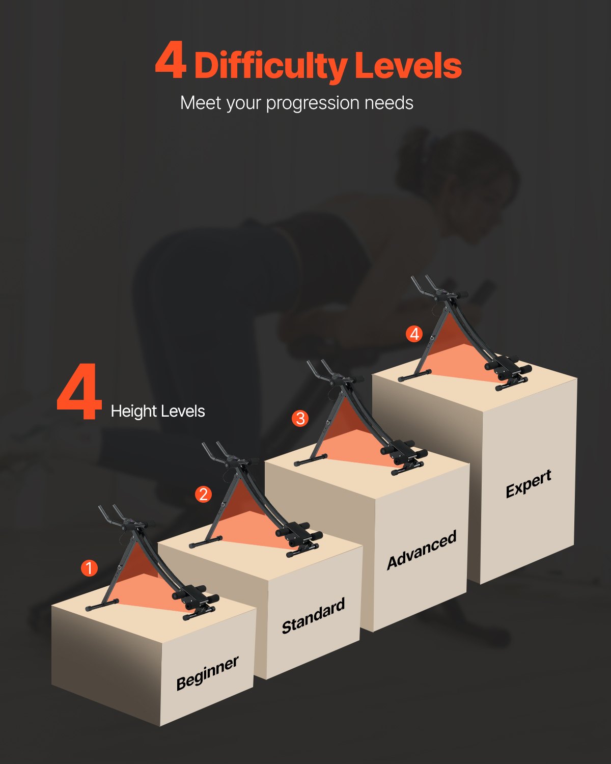 With 4 height adjustments, this home gym strength training ab cruncher caters to both beginner and advanced training needs, continuously providing varying intensity for the abs while accommodating different heights and strength levels. The higher the setting, the greater the difficulty.