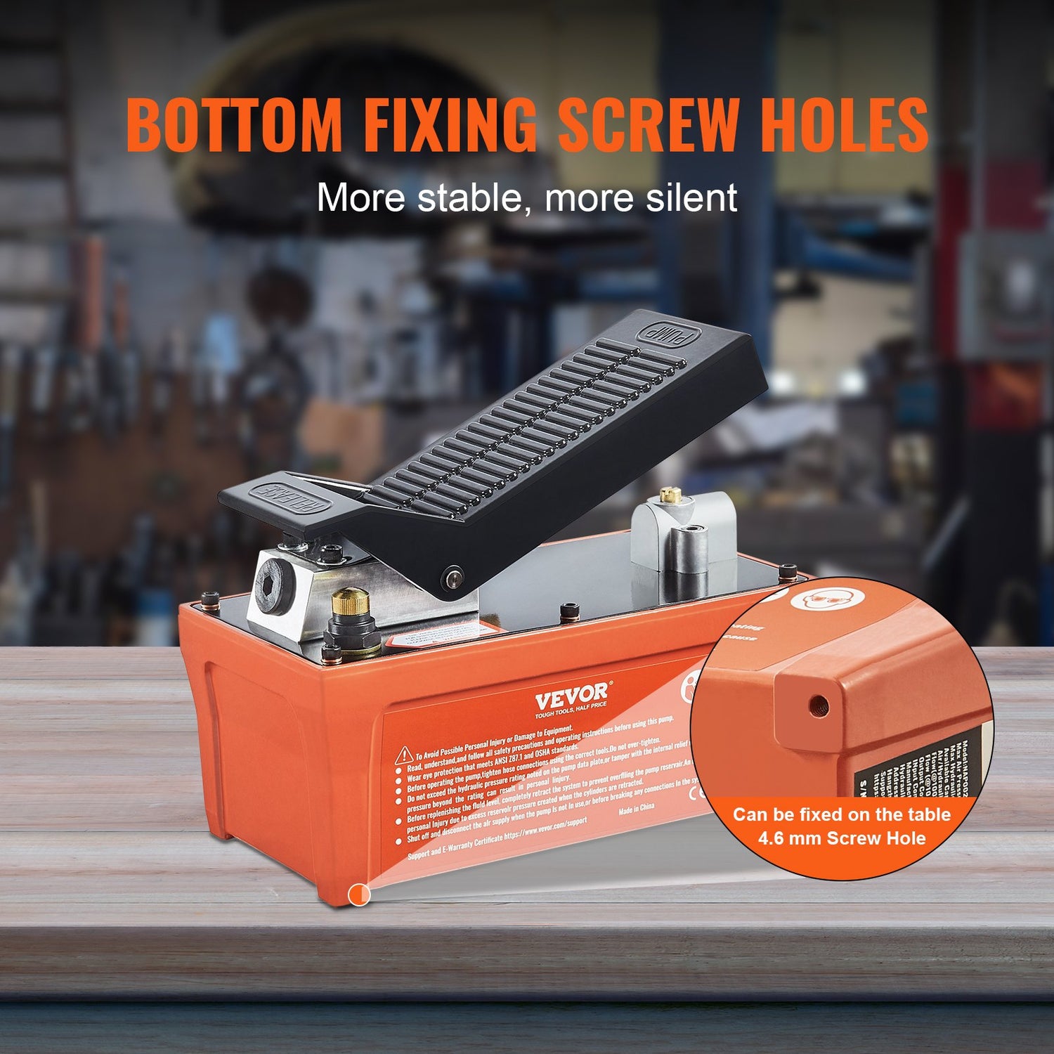 With two fixing screw holes located at the bottom, the foot actuated hydraulic pump can be securely positioned, minimizing sliding and vibration during operation. This results in a quieter working environment, providing you with a more comfortable experience.