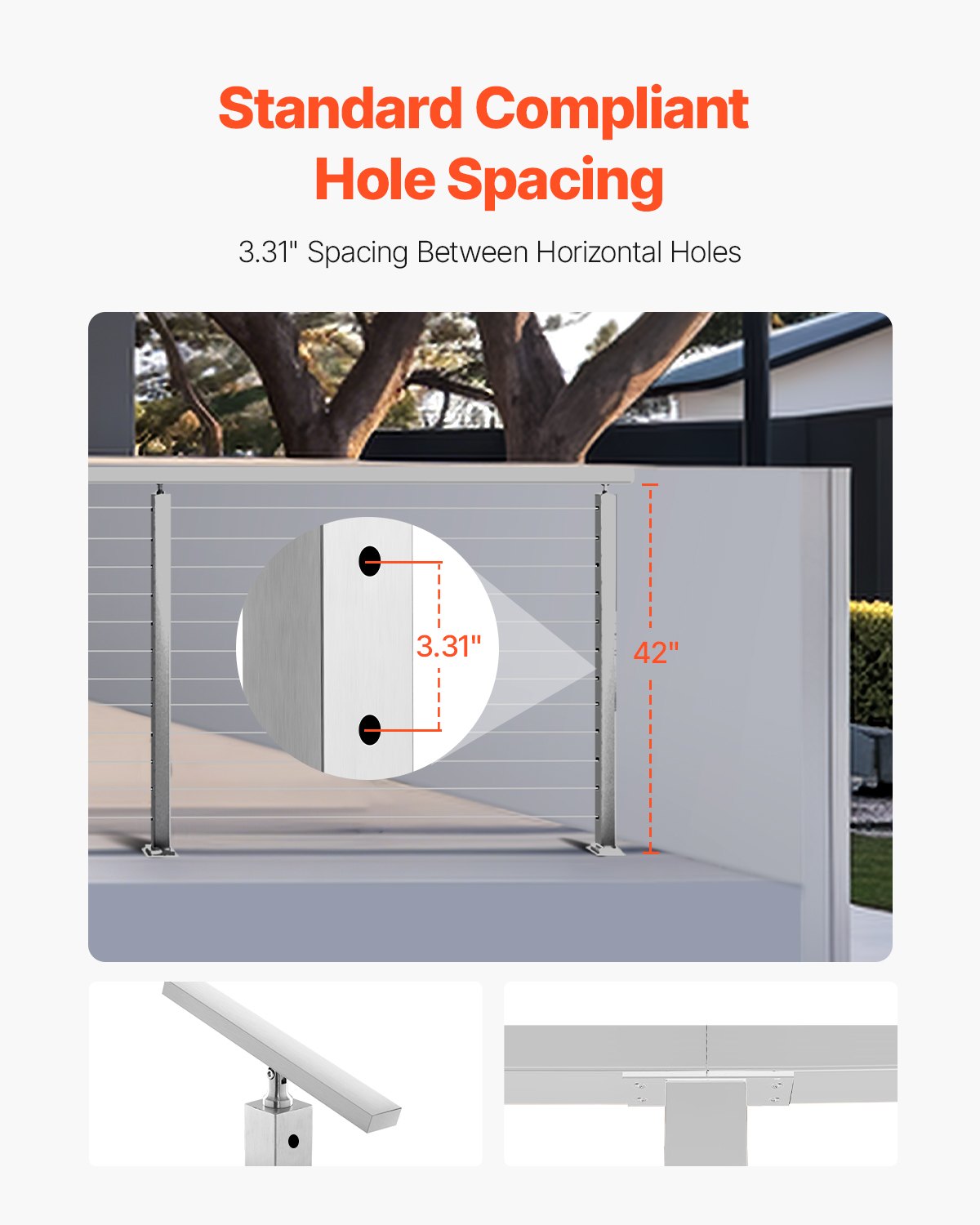 This horizontal hole cable railing post is available in 42" and 36" heights, with 0.31" and 0.41" holes, totaling 10-12 holes. It is designed for horizontal ground/deck railing protection, safeguarding you and your family. Note: This product does not include wire ropes