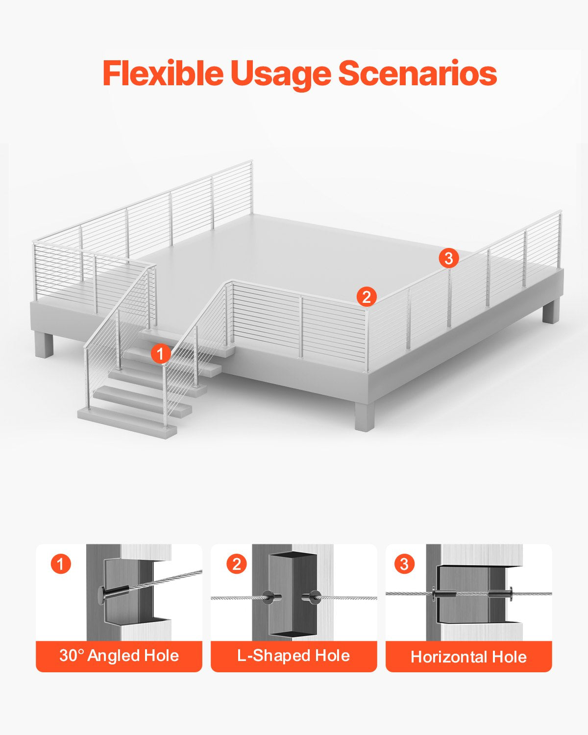 Our cable rail post is suitable for both indoor and outdoor protection, including decks, stairs, porches, fences, patios, balconies, gardens, residential buildings, commercial offices, hotels, garages, and more