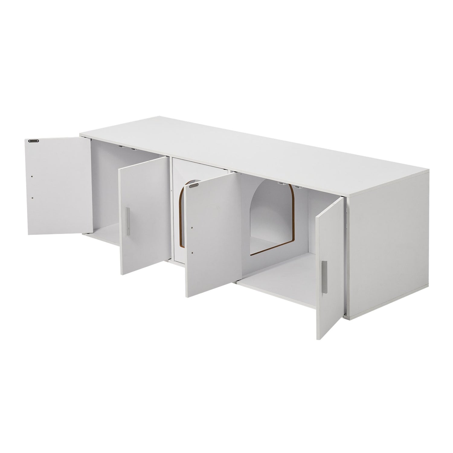 Measuring 57.9x18.3x17.9in, this cat litter box furniture provides a comfortable and free resting space for pets. It can accommodate cat litter boxes with a length of less than 21.9" and a width of less than 17.7". It is equipped with 5 doors and a window, connecting two cabinets for cats to access freely.