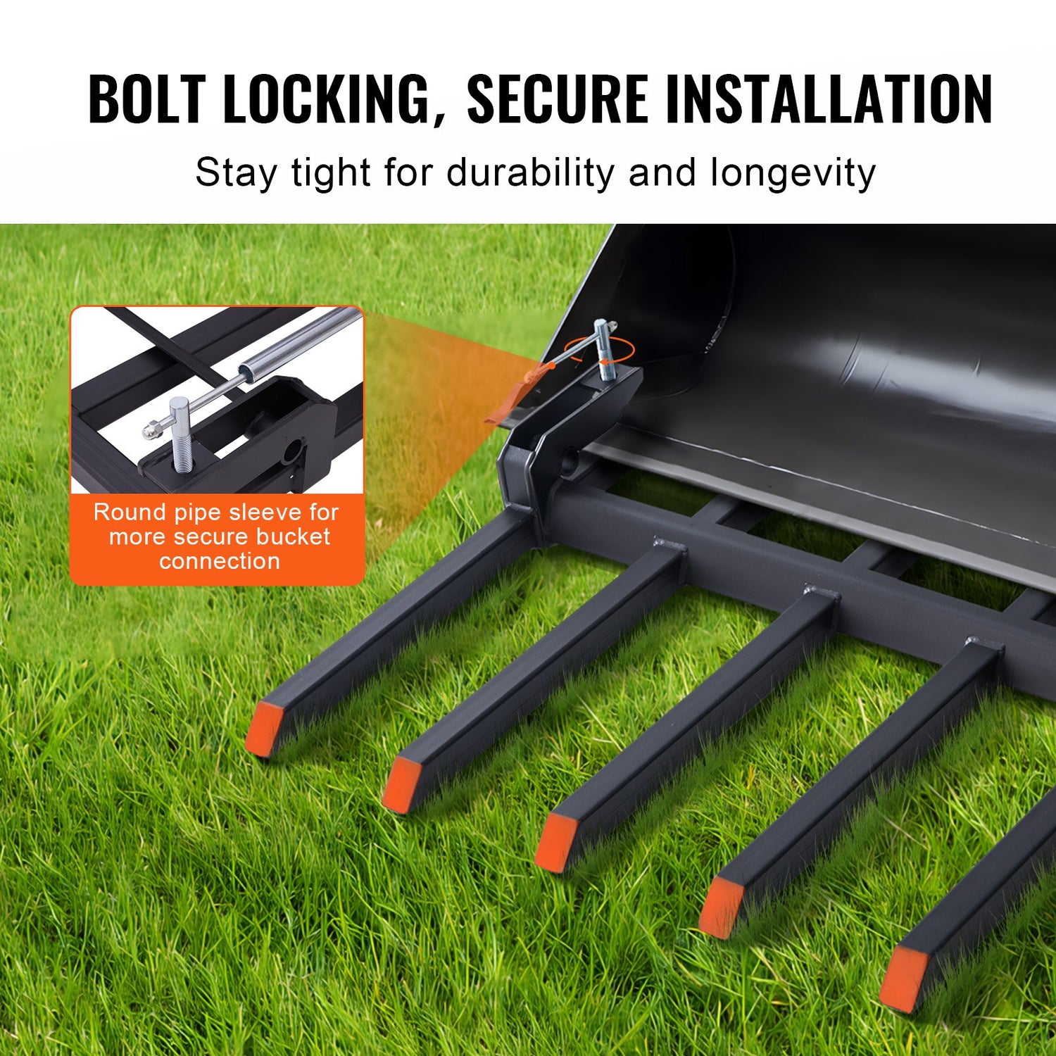 The debris forks for 60" tractor bucket can be used to easily clear debris around the workplace, such as wood, branches, etc. It is a versatile tool suitable for a wide range of projects and is widely used in landscaping and construction sites, logistic warehouses, and other places.