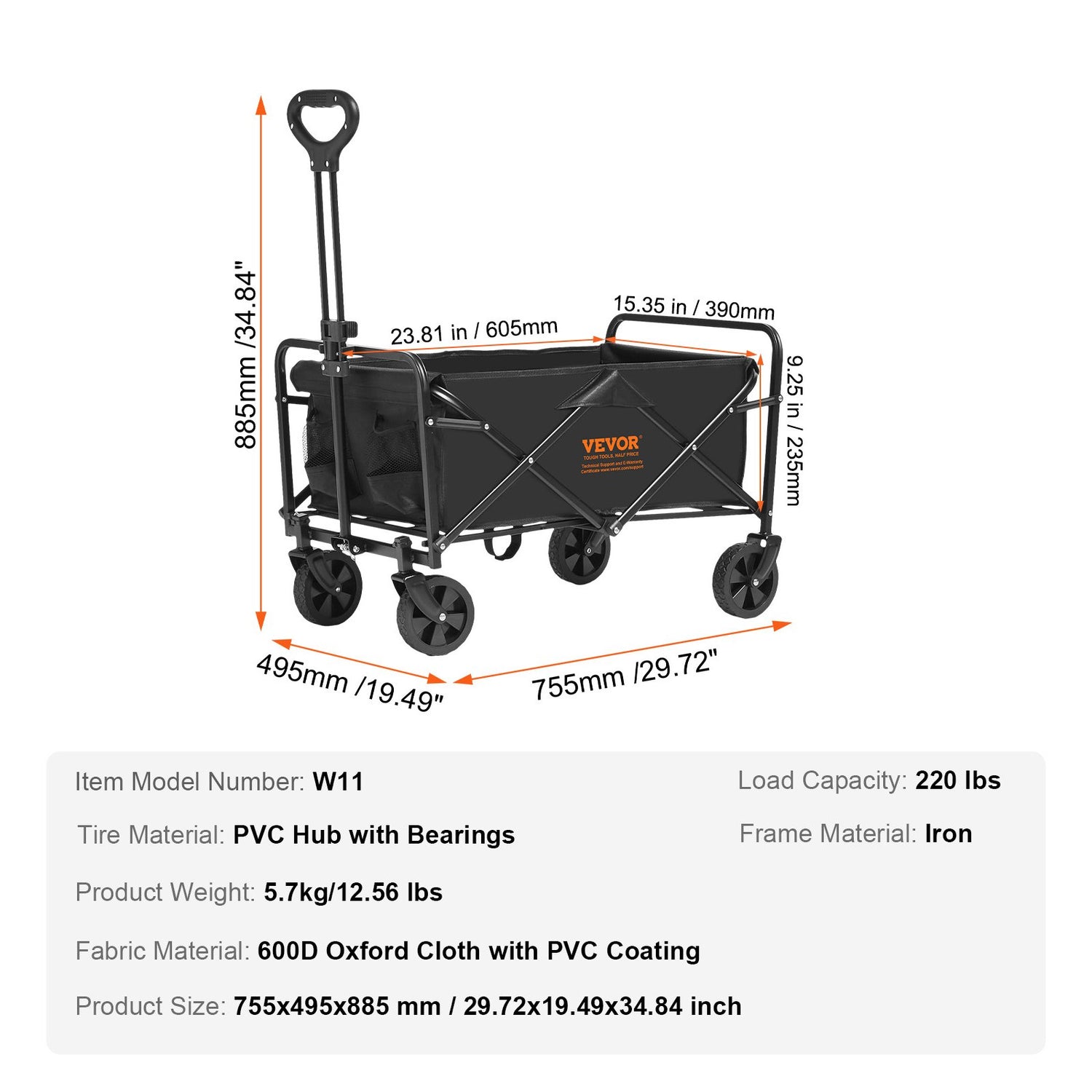 The folding wagon cart with 600D PVC-coated double-layer Oxford fabric, is waterproof and dirt-resistant, effortlessly tackling various outdoor challenges while keeping clean and tidy.