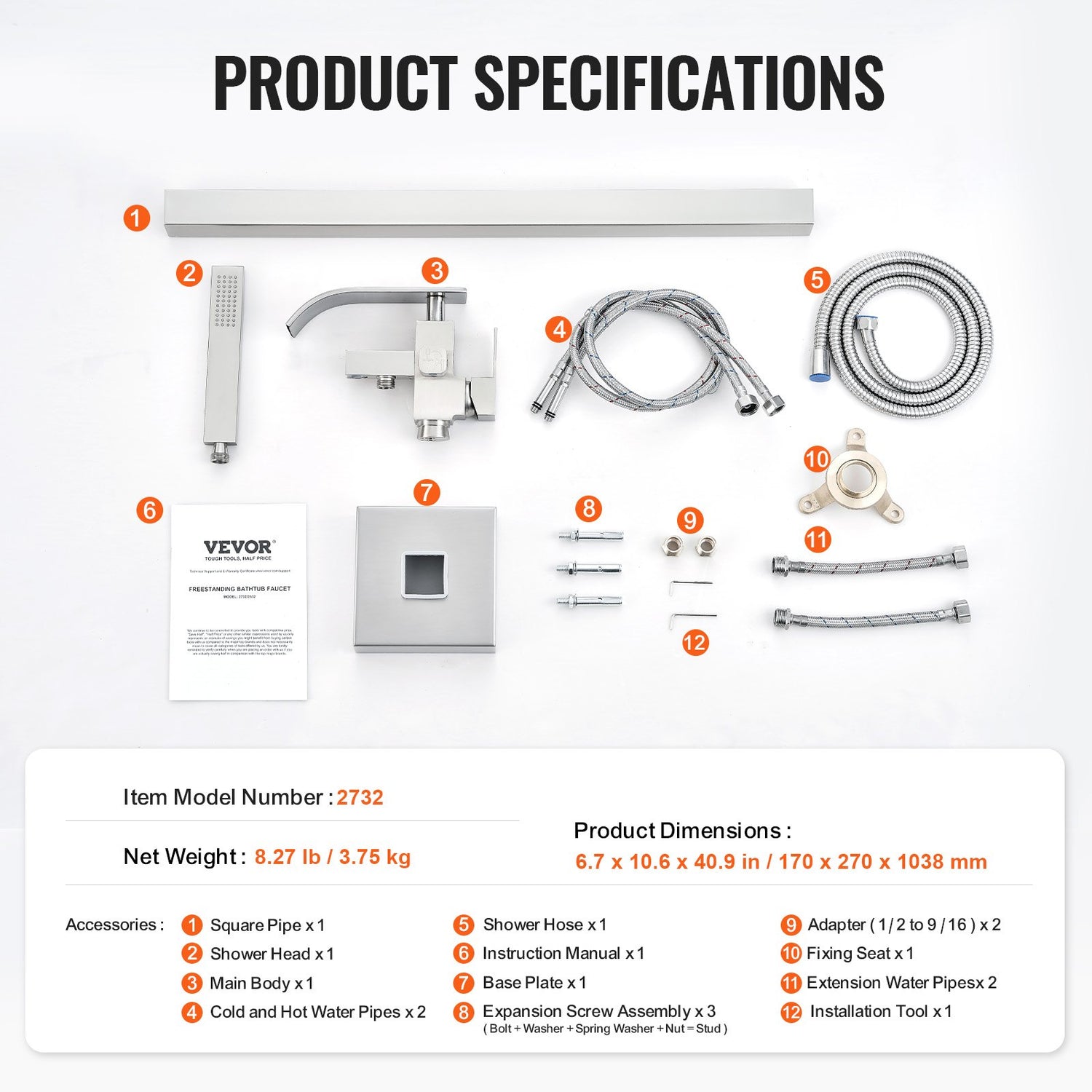 VEVOR Freestanding Bathtub Faucet, Floor Mount, Freestanding Tub Filler, Shower Mixer Taps, Two Water Modes, Swivel Spout, for Bathing & Showering Pet Bathing Cleaning Drains Toilet Flushing is backordered and will ship as soon as it is back in stock.