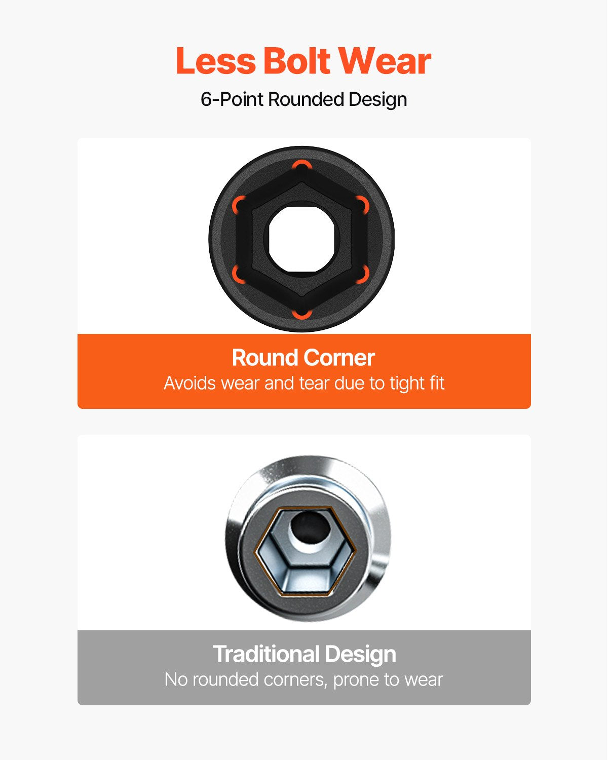 SUPERIOR PERFORMANCE- Whether you drive them with an impact wrench or by hand, these premium chrome vanadium sockets deliver superior performance. The impact socket set features a 6-point, high-torque design that contacts and grips the stronger flat sides of nut or bolt head, not the weaker corners.