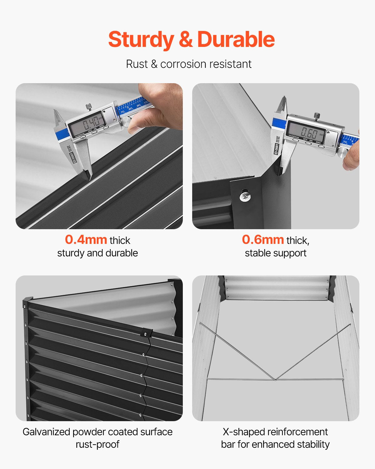 This metal raised garden bed is constructed with 0.4mm thick metal side panels and 0.6mm thick metal corner connector panels. The surface is coated with galvanized powder for rust and corrosion resistance, ensuring long-term use in outdoor environments. The 4 internal X-shaped reinforcement bars provide extra stability, preventing the bed from toppling in strong winds. Get ready to tackle the outdoors with confidence!
