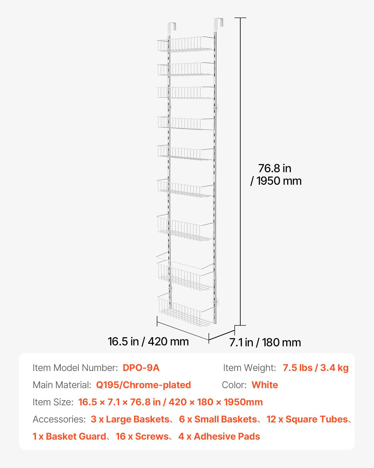 VEVOR Over the Door Pantry Organizer, 9-Tier Pantry Organization and Storage, Heavy-Duty Steel Hanging Spice Rack, Adjustable Wall Seasoning Shelves, for Home Kitchen Laundry Room Bathroom, White