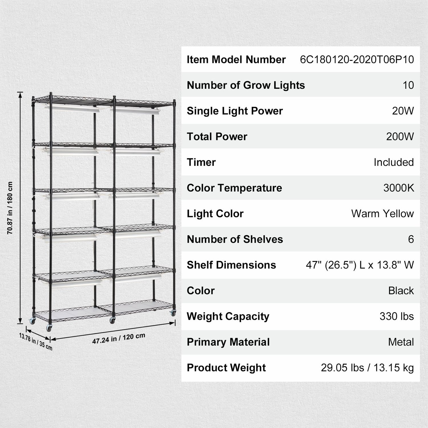 This high-density steel plant shelf with grow light boasts excellent rust and oxidation resistance, with dimensions of 47.2 x 13.8 x 70.1 in, and features 6 shelves measuring 47.2 x 13.8 in each. It supports up to 330 lbs, allowing you to vertically display multiple plants in a compact space. Equipped with three adjustable light settings, simply press the controller to start your planting journey.