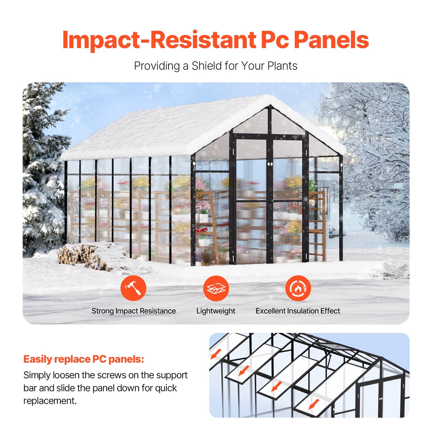 The backyard greenhouse is equipped with a thicker and stronger black aluminum frame, which is lightweight yet highly durable, with stainless steel screws for a longer service life and better resistance to harsh weather conditions.