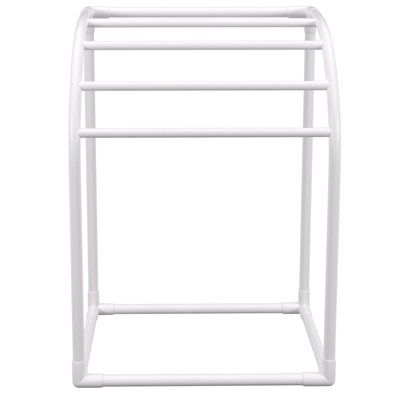 Our pool towel rack is crafted from heavy-duty PVC material that effectively resists rust and corrosion for years. The sleek, white PVC structure also blocks UV rays, preventing fading and making it easy to clean.