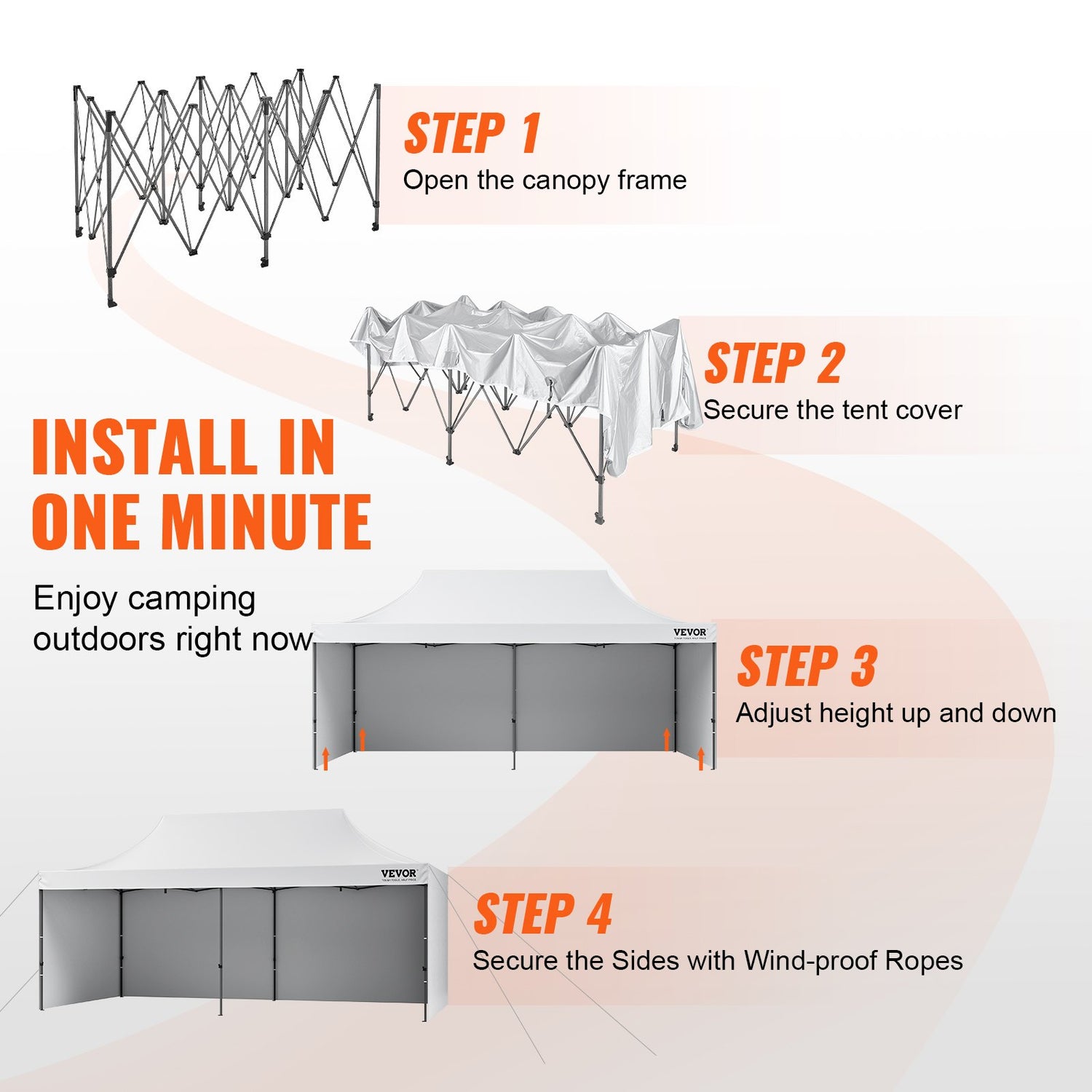 The detachable sidewalls are connected by seamless velcros, convenient and quick to assemble or disassemble. You can easily remove or install sidewalls, providing a well-ventilated space on hot summer days, or building a stable temporary shelter on windy or rainy days.