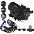 The self-priming 12V pump is equipped with an automatic pressure switch control that automatically opens and closes when you open and close the nozzle. It features 20 Liters per minute (5.5 GPM) capacity flow with a high pressure of 70 PSI and has built-in thermal overload protection.