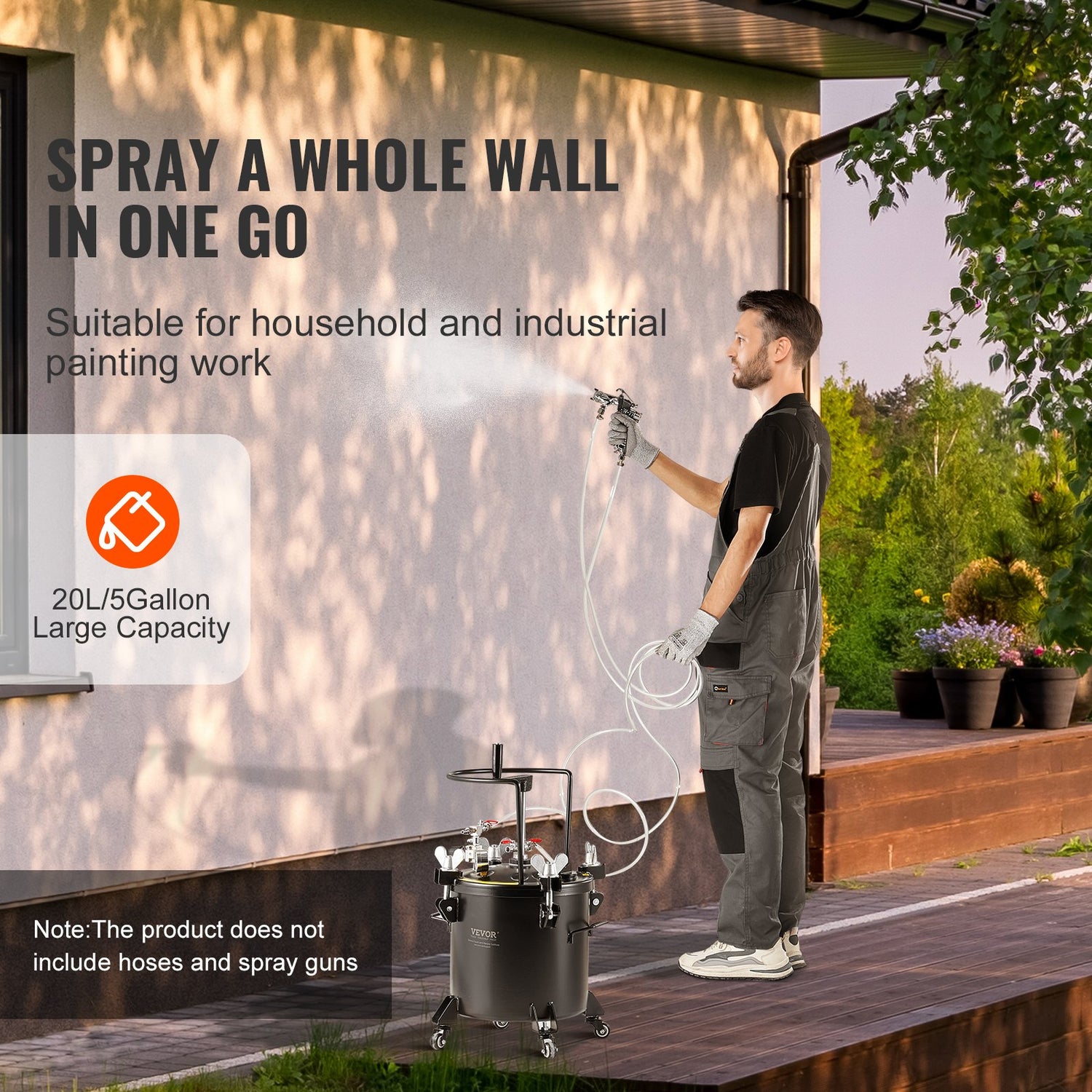 Introducing our state-of-the-art 20L/5gal spray paint pressure pot tank, with a 1/4" inlet and outlet port and a 3/8" fluid outlet port. Super capacity helps you complete industrial-grade spray projects more efficiently and with less energy.