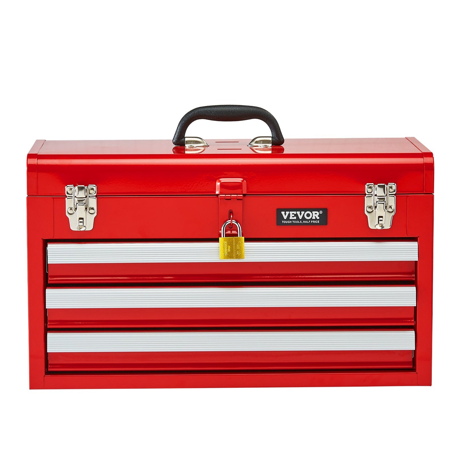 The portable metal tool box measures 20.5 x 8.6 x 12 inches and weighs 17.86 lbs, making it ideal for carrying tools while working on the go or storing them in your vehicle's trunk. It features 1 top box (19.9 x 8.2 x 2.1 inches) and 3 drawers (17.6 x 7.36 x 1.73 inches), with each layer supporting up to 15 lbs, providing plenty of storage space.