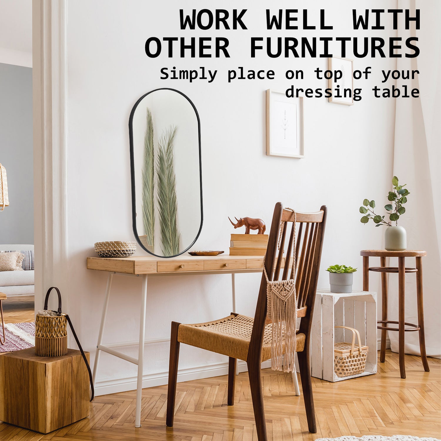 The oval mirror is stylish and neat in design comes with a 2.8cm thickness slender aluminium frame that is sure to capture the attention of all. Plus, its curved lines all rounds will become a central focal point in any room which makes spaces feel more inviting and relaxing.