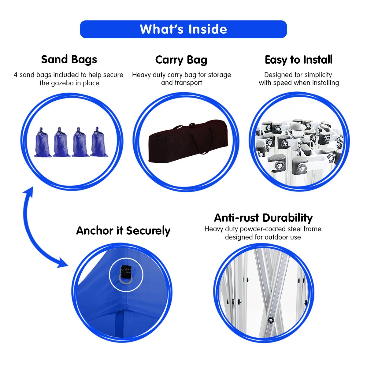 As well as the main unit and 5 walls this combo pack also comes with a handy carry bag and sandbags to help secure your marquee. And to make things a little easier our quality marquees are fitted with nylon inserts in the frame which eliminates frame jamming often experienced when erecting cheaper units.