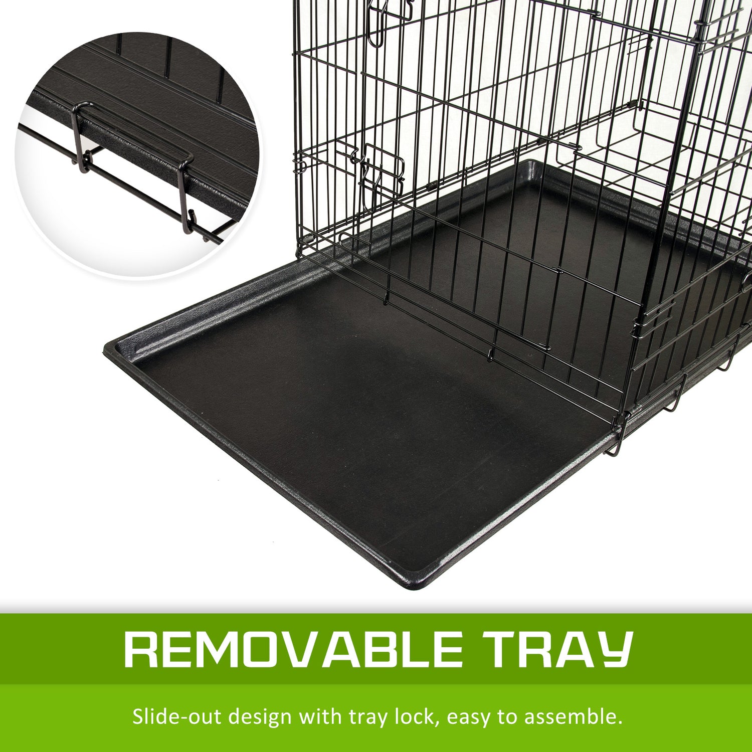 This convenient wire dog crate feature double access doors that provide easy access for your dog to easily enter and exit, as well as dual safety locks on each door to keep your pup securely inside. Built with quality sturdy wire construction with black powder-coated finish. The slide-out / removable plastic tray for easy cleaning.