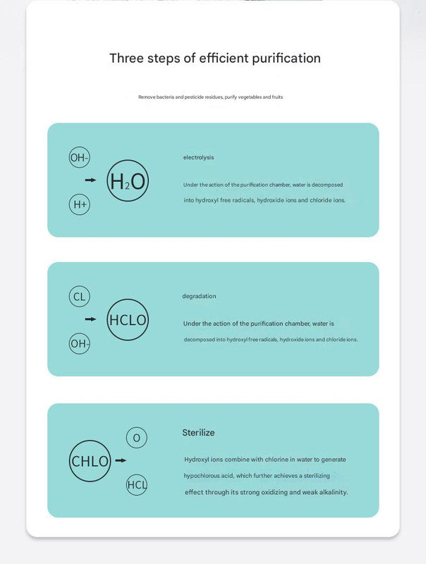 - Three-Step Efficient Purification: Electrolysis (decomposes water into hydroxyl radicals and chlorine ions), Degradation (breaks down residues), and Sterilization (hydroxyl radicals and chlorine combine to form hypochlorous acid for sterilization).