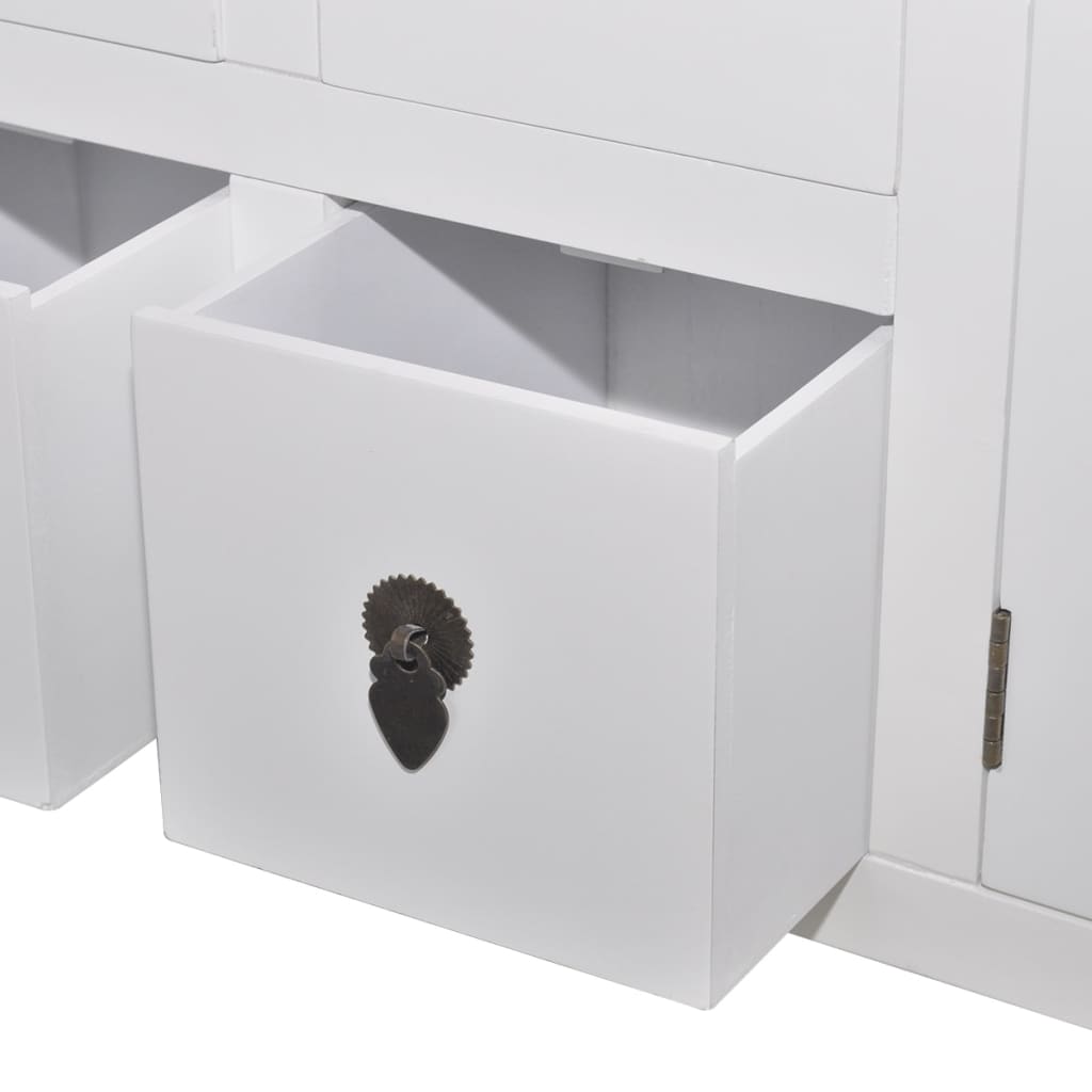 This wooden sideboard, with its classical Asian design, will be a great choice for organising and storing day-to-day items. It is also a great choice to be used as a TV cabinet. This unique sideboard/TV cabinet will make a great addition to your bedroom, study, or even hallway. This sideboard has 8 compartments for storing different types of items and trinkets. Constructed from high-quality MDF and pinewood with a white paint finish, this sideboard/TV cabinet is highly durable.