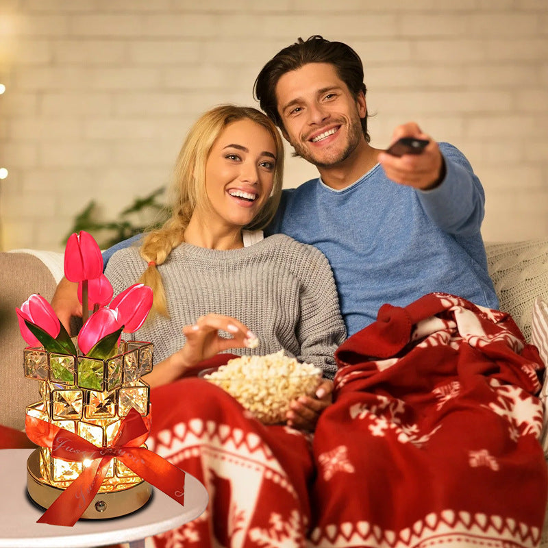 Brighten your space with the enchanting glow of this Crystal Tulip Night Light. Combining the delicate beauty of tulips with a modern crystal cube base, this lamp serves as both a sophisticated decoration and a versatile light source. Perfect as a bedside lamp, mood light, or a thoughtful gift.